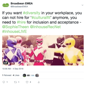 Second takeaway: diversity is not a numbers game. We need to educate our leaders, our teams, our colleagues, and dissuade them from this tick box mentality. It goes beyond your ethnicity, your gender, your age – it’s about your values, your background, your story. And that is why we need to see a shift from hiring for ‘cultural fit’ to hiring for inclusion and acceptance. Business leaders must encourage their teams to get acquainted with one another. She proceeded to explain how you must tackle this from a top down perspective. If your panel of hiring managers does not represent diversity, how can you expect their choices to be different?